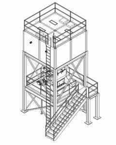 - Het gebrande opslag- en mengsysteem mondt uit in Chain-Veys eronder, die de koffie naar een supersack-vulstation en een rollende trechter transporteren.
